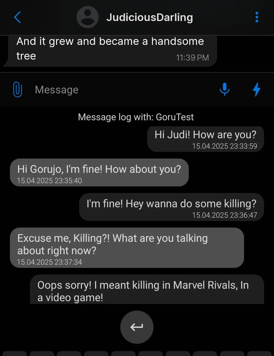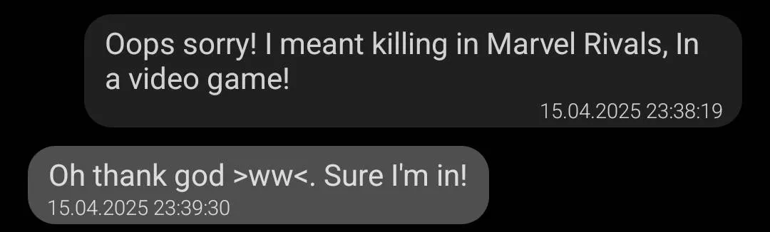 I have to say that I intentionally made this kind of conversation, and to demonstrate what happens if those messages were scanned (either on-device or before it gets encrypted), that "killing" phrase I made could have triggered the quote on quote "scanning messages" system and falsely classified me as a murderer or something like that, if the rest of the context wasn't revealed, but even then, if they had the context, if the government agencies were to trust the algorithms instead of using their own thinking and/or justifying only part of the conversation, I would be badly screwed. Despite the context, by the way, was actually about a mistake in my wording, and that the killing I meant was to do it in the video game "Marvel Rivals" to have some fun! And we did play a fun Marvel Rivals video game with Judi, you can ask them and me!