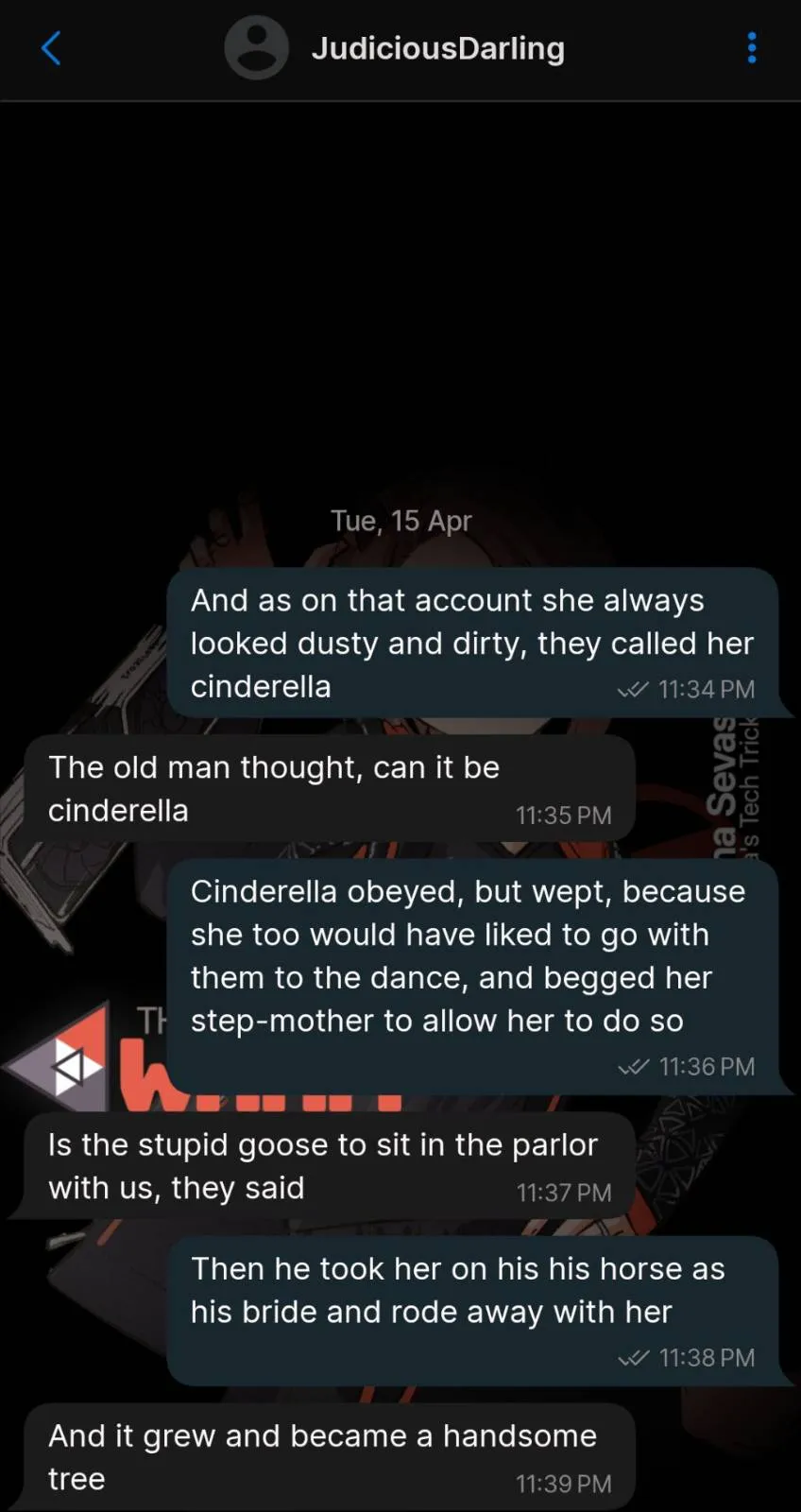 What are you thinking when you see this? A likely response would be "Someone and Judi telling a weird bedtime [or fairy tale] story". And you would be correct. But actually hidden in that fairy tail conversation is a conversation that we can't see between that Someone and Judi and we will never have an idea because the conversation is end to end encrypted and therefore only both can see it. With apps like Signal, the metadata, down to the name, is also never known to any third party, nor can Signal tell, down to the stickers and stories too, everything is end-to-end encrypted!